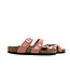 Sommerliche Birkenstock Mayari Sandalen für Mädchen in Altrosa mit überkreuztem Zehenriemen und roségoldenen Schnallen. Das Veloursleder-Fußbett und die verstellbare Schnalle bieten beim Gehen zusätzlichen Halt, und dank der leichten Korksohle merkt sie kaum, dass sie Schuhe trägt. Das Birkenstock-Logo ist auf der Schnalle, der Seite und dem Fußbett zu finden.