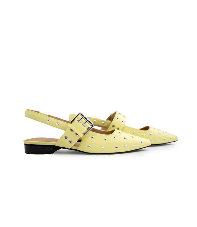 Diese pastellgelben Cycleur de Luxe Slingbacks aus Leder sind ein echter Blickfang. Die spitze Form verleiht dem Schuh eine elegante Silhouette, während die rundum platzierten Nieten für einen modischen, markanten Look sorgen. Die breite, glänzende Schnalle setzt ein stilvolles Statement.