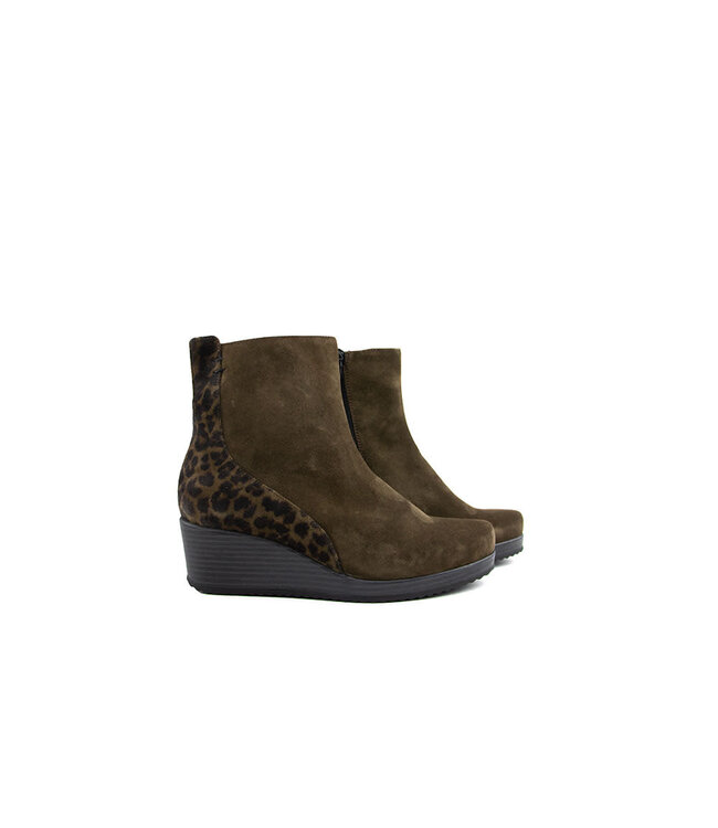 Robuste Damen-Wedges von Durea in einem schönen Stiefeletten-Modell. Die Stiefeletten sind aus olivgrünem Veloursleder gefertigt und auf der Rückseite mit einem Leopardenmuster versehen.
