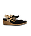 Sportliche Durea Damensandalen aus schwarzem und sandfarbenem Veloursleder. Sie haben eine geschlossene Vorderseite, ein Muster auf der Ferse und eine elegante Zierschnalle. Der Keilabsatz sorgt dafür, dass die Beine optisch länger wirken und besonders schön zur Geltung kommen. Das herausnehmbare Fußbett ermöglicht das Tragen von Einlagen. Die H-Weite bietet ausreichend Platz für etwas breitere Füße. Anziehen ist dank des Klettverschlusses kinderleicht. Das Gesamtbild ist sportlich, stilvoll und durch das Schwarz vielseitig kombinierbar.