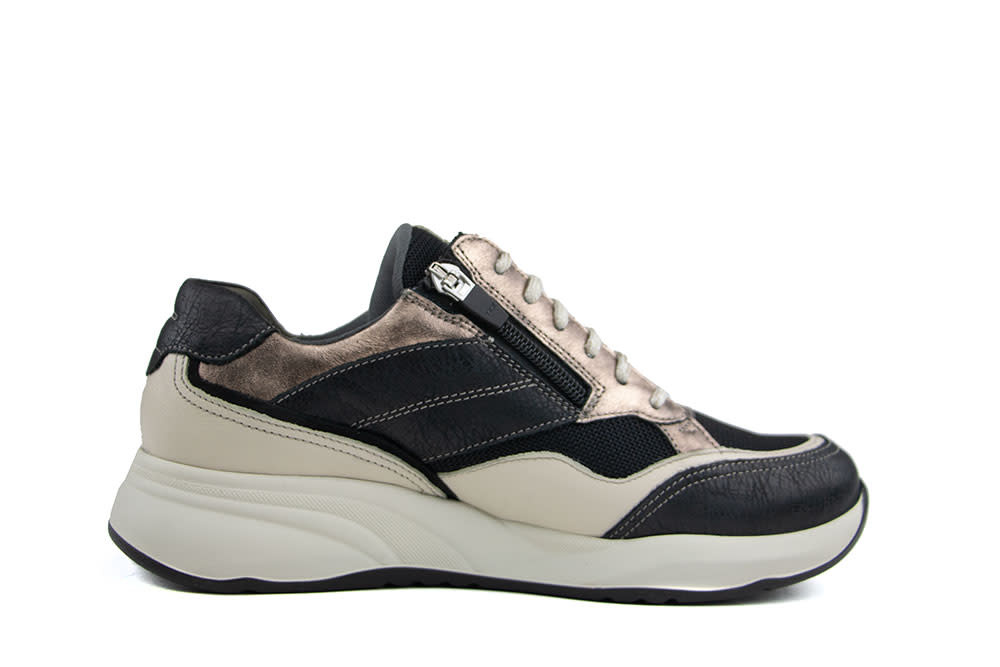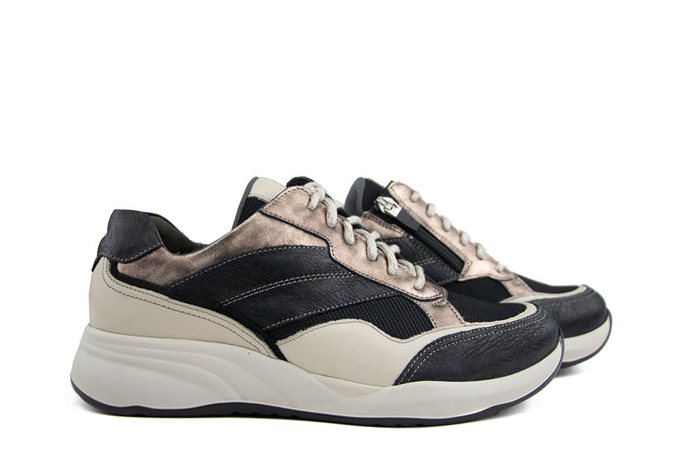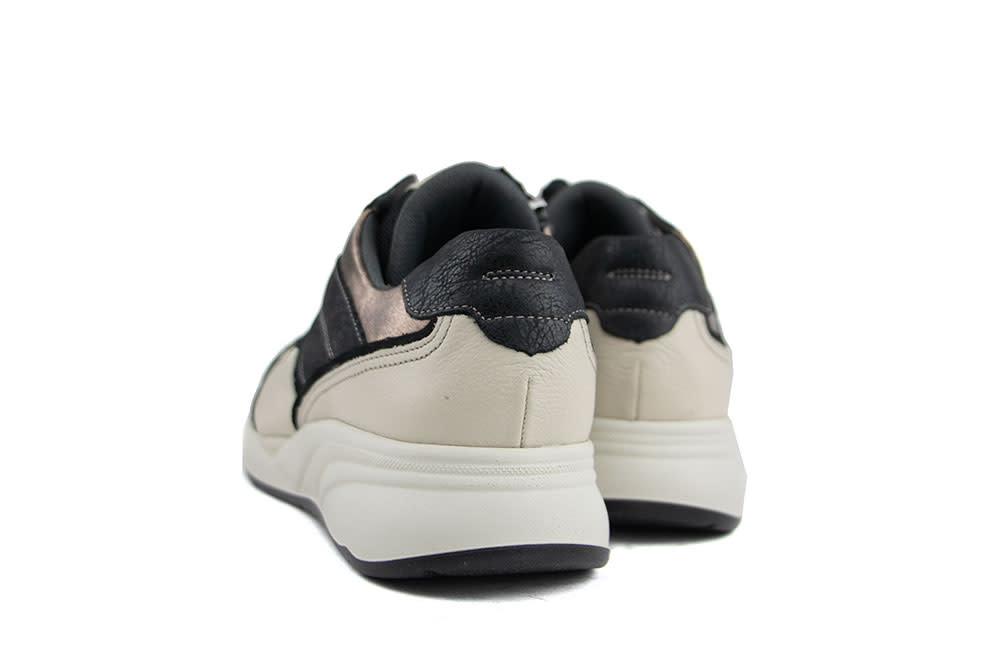 Gefertigt aus beige, goldfarbenem und schwarzem Leder in Kombination mit atmungsaktivem Mesh für einen frischen und zeitgemäßen Look. Durch die Kombination aus Schnürung und Reißverschluss an der Innenseite lassen sie sich leicht an- und ausziehen. Das Innenfutter aus Leder und Textil sorgt für ein angenehmes Tragegefühl – auch bei längerem Tragen.