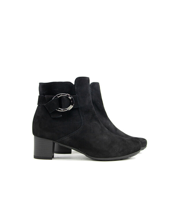 Ein wunderschöner, zeitloser Ankle Boot von Gabor. Diese Damen-Stiefeletten sind aus weichem, schwarzem Nubukleder gefertigt. An der Seite auf Knöchelhöhe befindet sich eine große Schnalle, die dem Modell einen modischen Akzent verleiht. Auf der Innenseite sorgt ein robuster YKK-Reißverschluss für leichtes An- und Ausziehen.