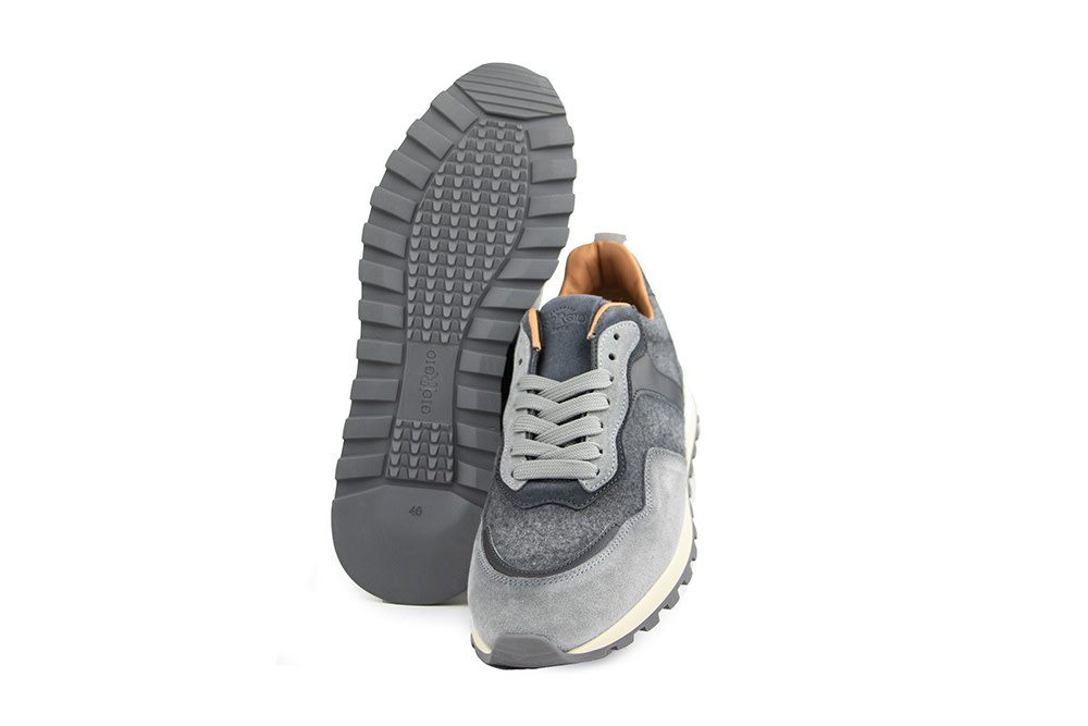 Diese grauen Sneaker von Giorgio vereinen sportliches Design mit edlen Details. Die Filzoberfläche wird elegant durch Wildledereinsätze und ein Leder-Overlay an der Seite ergänzt, was dem Schuh eine moderne und gleichzeitig stilvolle Note verleiht. Die dreifarbige Sohlenkante sorgt für einen markanten Look, während die textile Zuglasche an der Ferse, die über die Rückseite verläuft, einen modernen Akzent setzt.