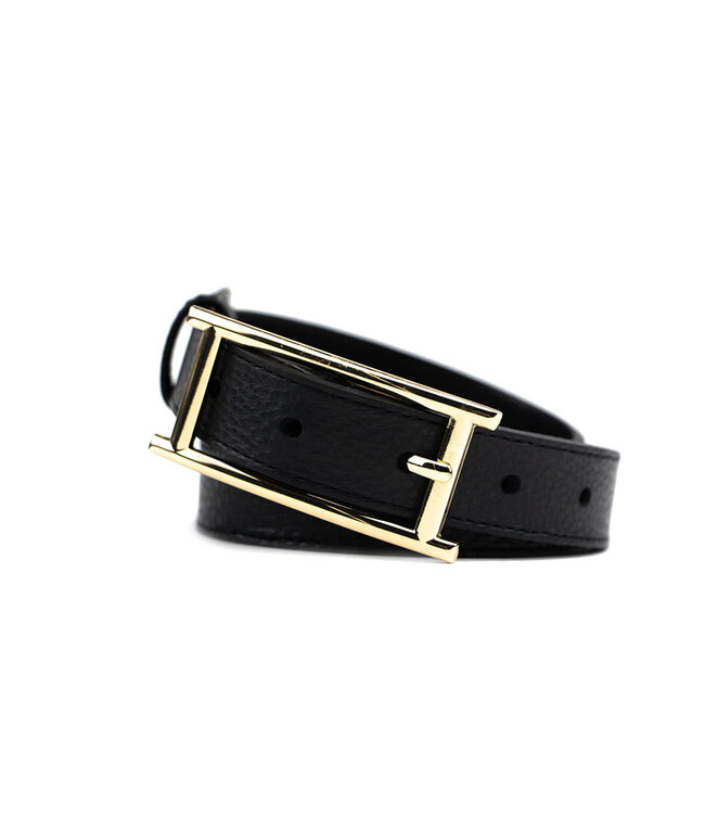Schöner schmaler HAN Damengürtel aus schwarzem Leder. Er verfügt über ein feines Muster im Leder und eine auffällige, schmale, goldfarbene Schnalle. Der Gürtel wird mit einer Schnalle geschlossen. Er ist in vier verschiedenen Längen erhältlich. Die schwarze Farbe macht den Gürtel zum perfekten Accessoire für das ganze Jahr.