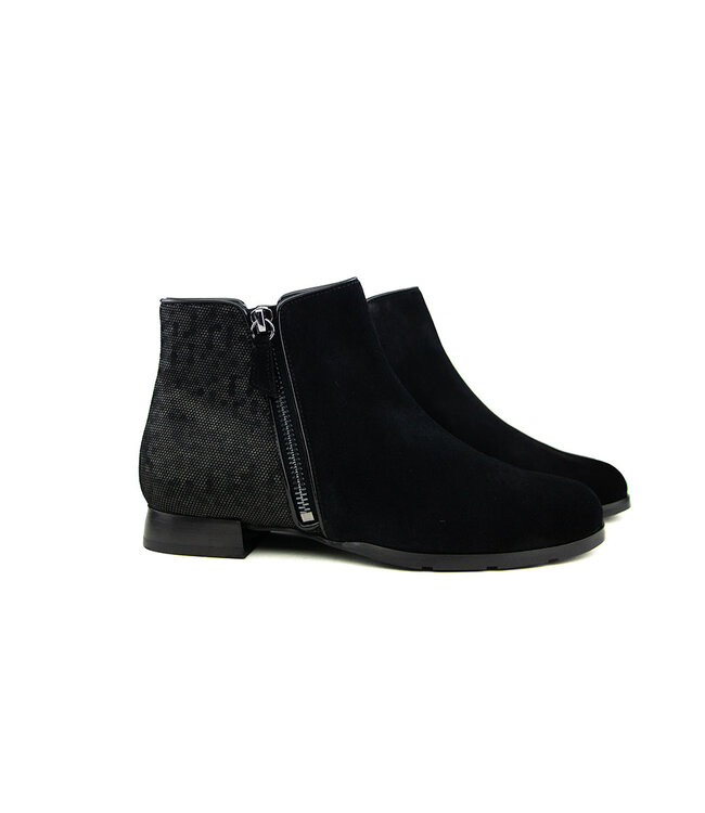 Gefertigt aus weichem schwarzem Veloursleder mit einem dezent schimmernden Metallic-Pixelprint an der Ferse, setzen diese Schuhe modische Akzente. Für zusätzlichen Komfort sorgt ein elastischer Einsatz an der Innenseite, während ein Reißverschluss an der Außenseite das An- und Ausziehen besonders einfach macht.