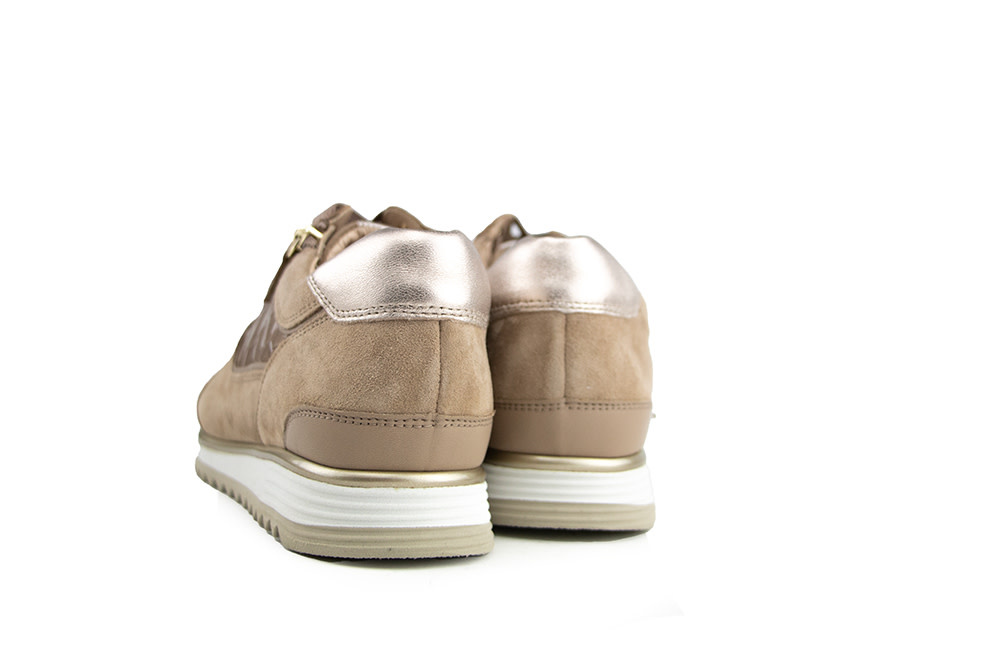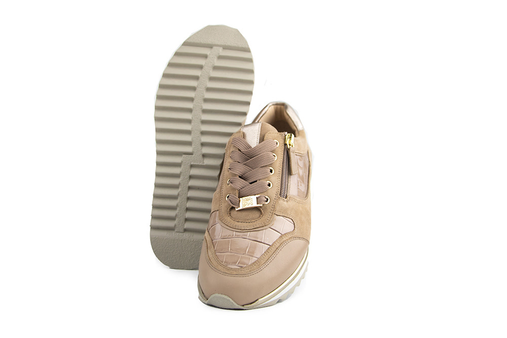 Diese taupefarbenen Hassia Sneakers aus Veloursleder vereinen Stil und Tragekomfort. Die Lackleder-Croco-Prägung auf dem Rist und an den Seiten verleiht dem Schuh einen raffinierten Look, während der metallic-goldene Lederbesatz an Zunge und Ferse einen edlen Glanz hinzufügt. Die farblich abgestimmte Sohle in Weiß, Taupe und Gold rundet das Design ab.
