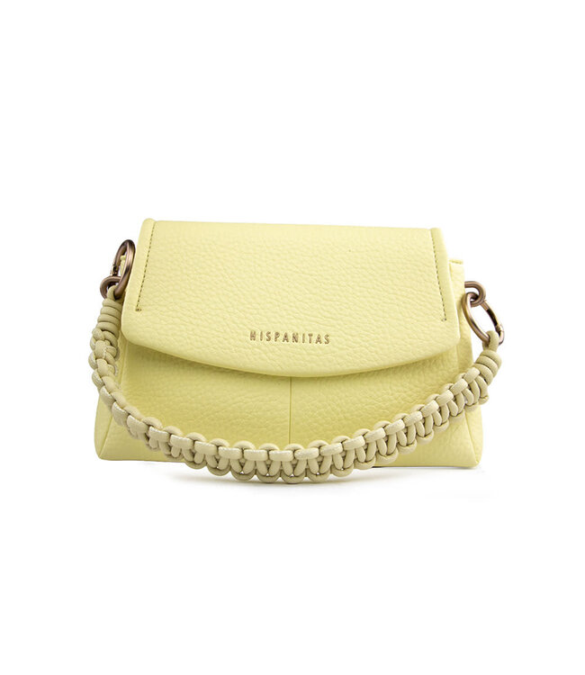 Damentasche, 26 x 16 x 8 cm. Aus hellgelbem, genarbtem Leder. Kurzer, geflochtener Henkel. Ein schmaler Schulterriemen kann an der Tasche befestigt werden, sodass sie sowohl als Schultertasche als auch als Handtasche getragen werden kann. Stofffutter mit zwei kleinen Innentaschen, eine davon mit Reißverschluss.