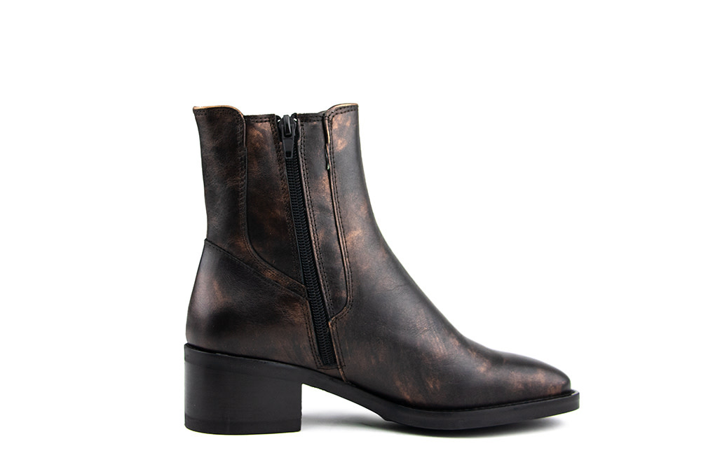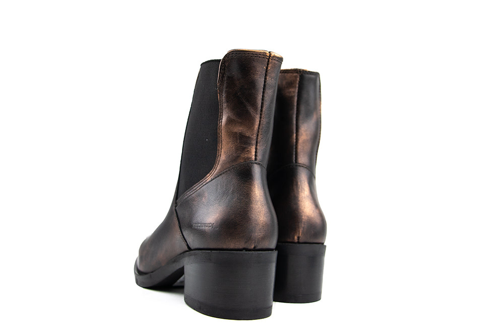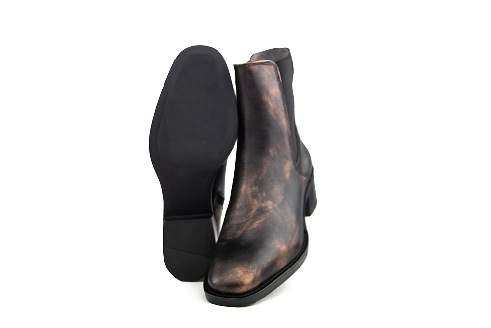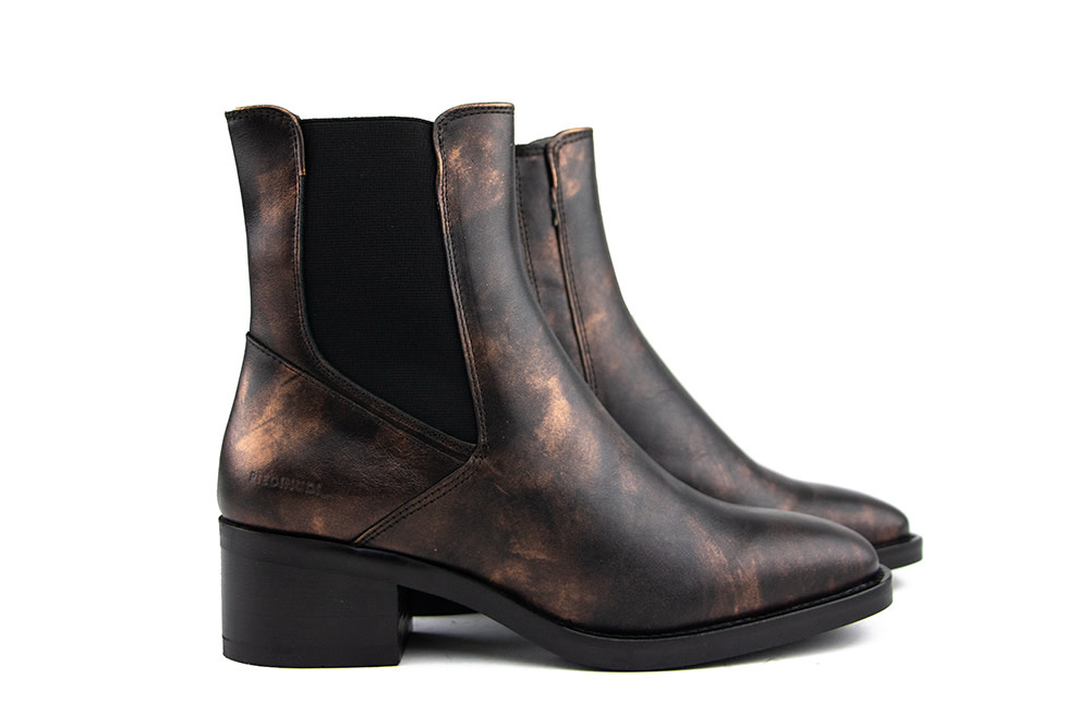 Diese Stiefeletten von Piedi Nudi vereinen zeitlose Eleganz mit einem modernen Look. Das bronzefarbene Leder mit anthrazitfarbenem Metallic-Finish sorgt für einen edlen, aber zugleich lässigen Charakter. Das besondere Lagenspiel an der Seite macht diese Schuhe zu einem echten Hingucker.