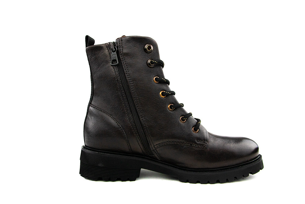 Die Piedi Nudi Gwen 01.03 Stiefel sind gleichzeitig robust und stilvoll. Das matte braune Leder wird durch kupferfarbene Ösen und dezente Farbdetails auf den schwarzen Schnürsenkeln aufgewertet. Ein Textilband mit verspieltem Muster auf der Rückseite verläuft in eine Schlaufe an der Ferse und verleiht den Boots einen einzigartigen Look. Die gepolsterte Zunge sorgt für zusätzlichen Tragekomfort.