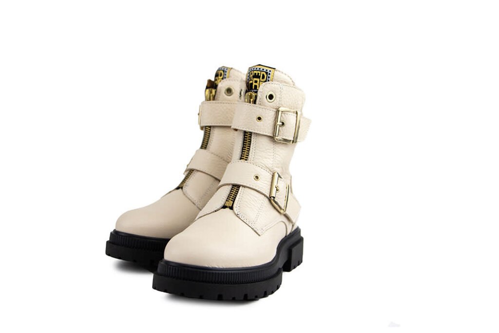 Die Stiefel sind aus off-white Nappaleder gefertigt und haben weiche, gepolsterte Elemente rund um den Knöchel. Das Futter besteht aus Leder, und die dicke Laufsohle aus Gummi sorgt für Stabilität und Komfort.