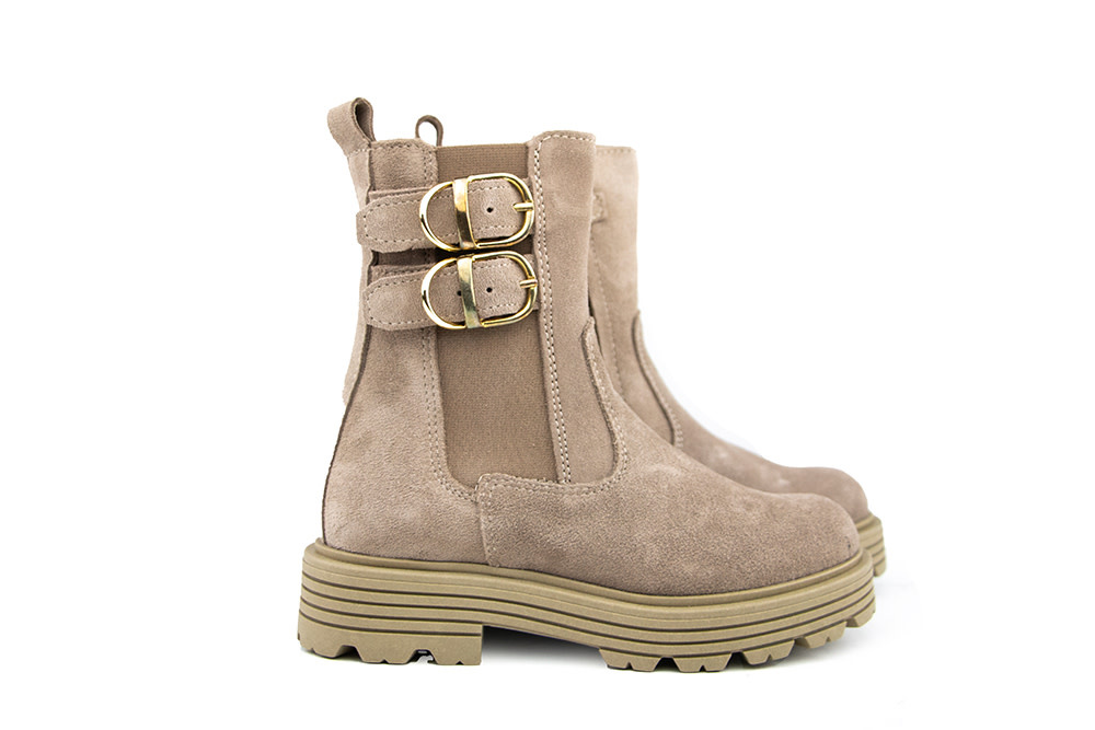Diese taupefarbenen Stiefel aus Veloursleder von Red Rag sind echte Hingucker! Mit ihrem hohen Schaft, zwei breiten goldfarbenen Schnallen und dem schmalen Gummieinsatz an der Seite wirken sie gleichzeitig cool und elegant.