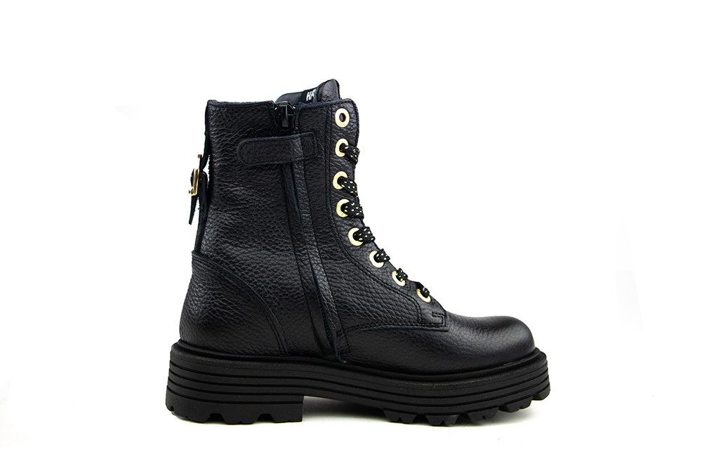 Diese schwarzen Schnürboots aus Leder von Red Rag sind ein echtes Highlight! Die dezente Prägung im Leder, die goldfarbene Schnalle und goldene Details in den Schnürsenkeln machen sie besonders stylisch.