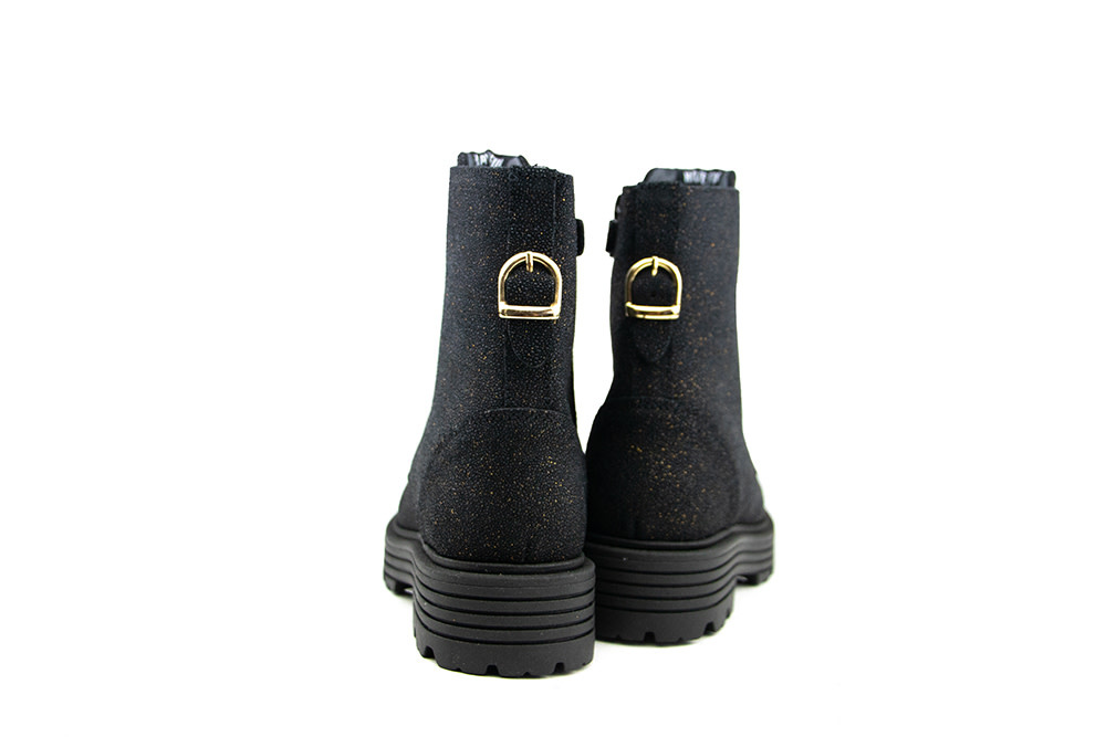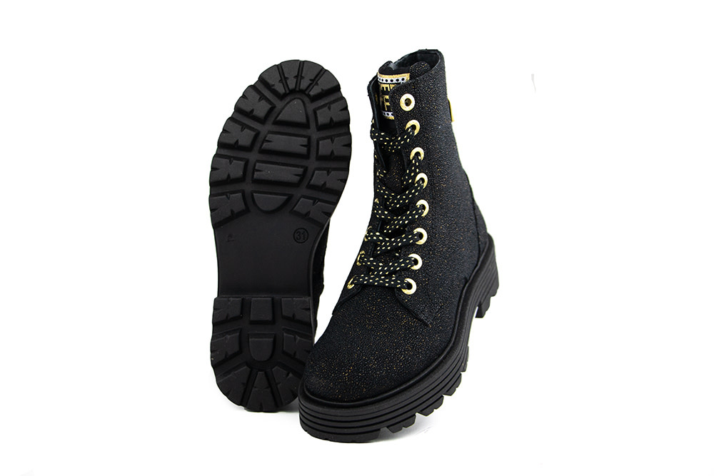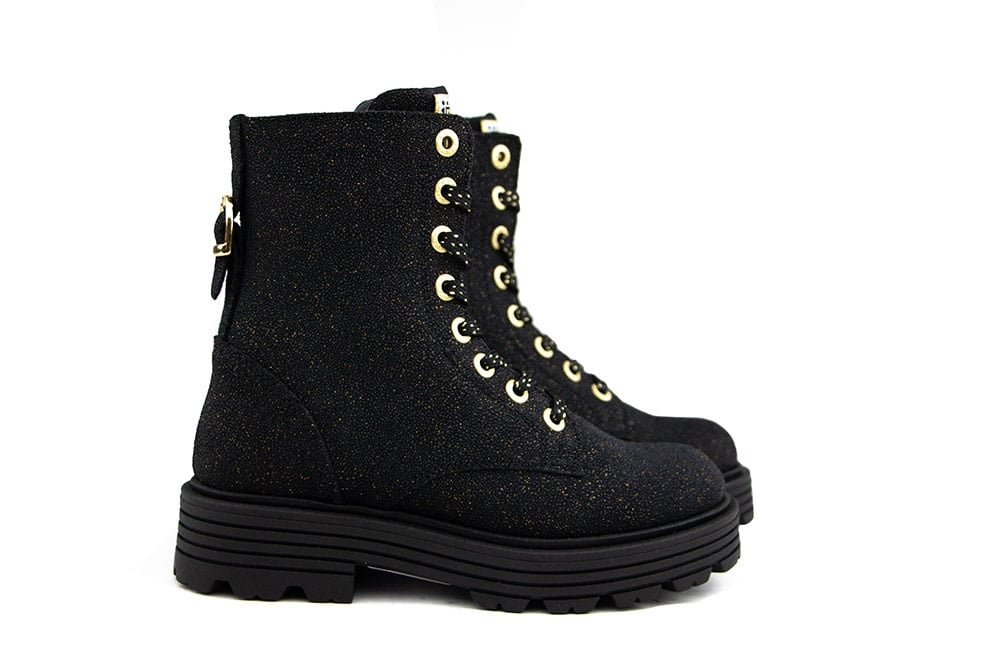 Diese schwarzen Schnürboots aus Leder von Red Rag bringen Glamour in den Alltag! Mit ihrem feinen Glitzer-Finish, der goldfarbenen Schnalle an der Ferse und den goldenen Details an Ösen und Schnürsenkeln ziehen sie alle Blicke auf sich.