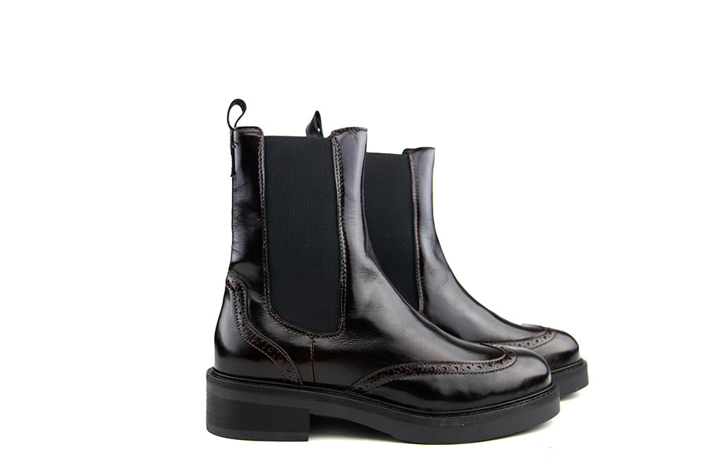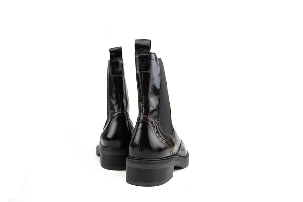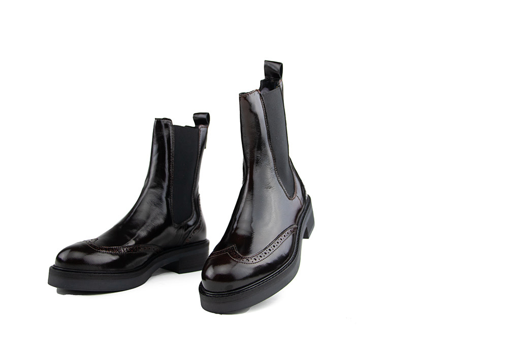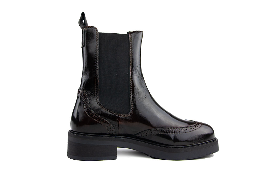 Die Via Vai Lucia Gina Eris Chelsea-Boots beeindrucken mit glänzendem Lackleder und dezentem Brogue-Muster. Die hohe Schaft mit seitlichen Stretcheinsätzen und die Lederschlaufe an der Ferse sorgen für den typischen Chelsea-Look. Die robuste Gummisohle mit 4 cm Absatz und verstärktem Profil verleiht den Boots eine moderne, markante Note. Ein dezentes Logo-Detail rundet das Design elegant ab.