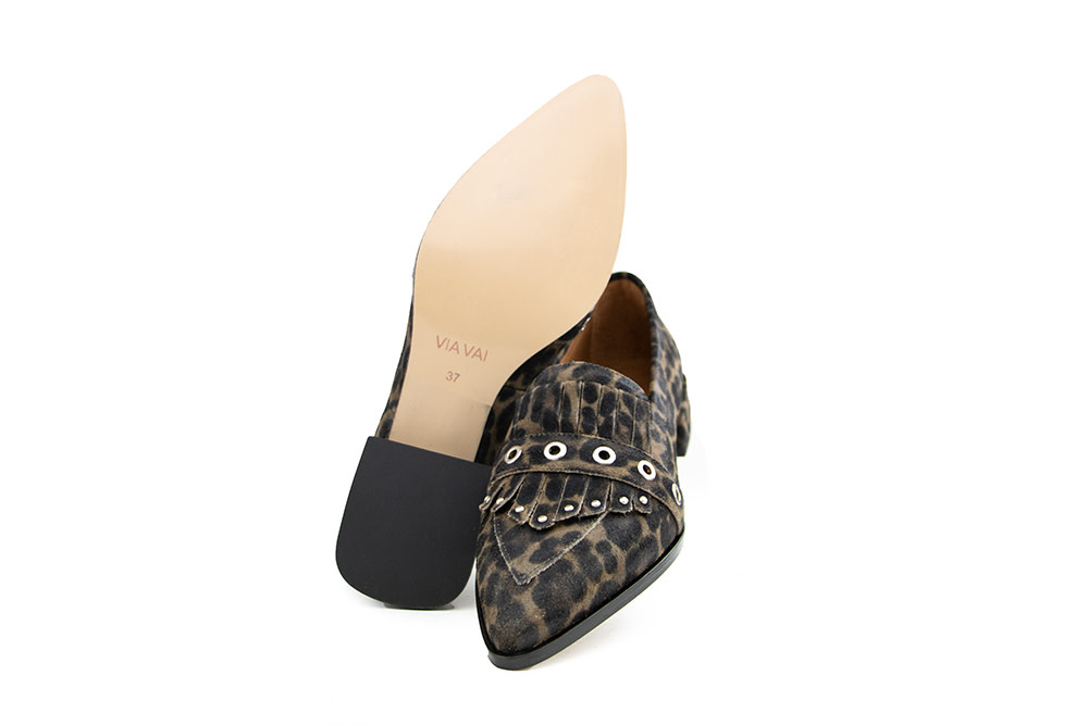 Diese braunen Via Vai Jazz Emily Bisonte Damen-Loafers sind ein echter Hingucker für stilbewusste Frauen. Der auffällige Leopardenprint und die Zungenlasche mit Fransen und Nieten verleihen einen verspielten, trendigen Look. Das Riemchen über dem Spann mit Metallringen setzt ein starkes Detail, während die spitze Form mit Spiegelnaht für Eleganz sorgt. Das bedruckte Suede zieht sich über den 2 cm hohen Blockabsatz, wodurch ein harmonisches Gesamtbild entsteht.