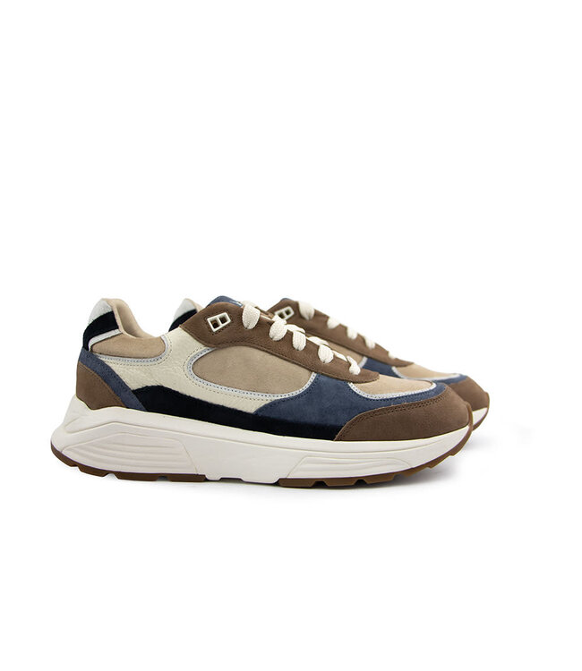 Das Obermaterial besteht aus einer Mischung aus braunem und blauem Veloursleder, kombiniert mit cremefarbenen Lederakzenten. Diese Farbkombination verleiht dem Sneaker einen frischen, stilvollen Look und lässt sich einfach zu Jeans, Chinos oder Casual-Hosen kombinieren. Die weißen Schnürsenkel setzen einen modernen Akzent. Durch die Weite H bietet der Sneaker etwas mehr Platz im Vorfußbereich und sorgt so für eine entspannte Passform.