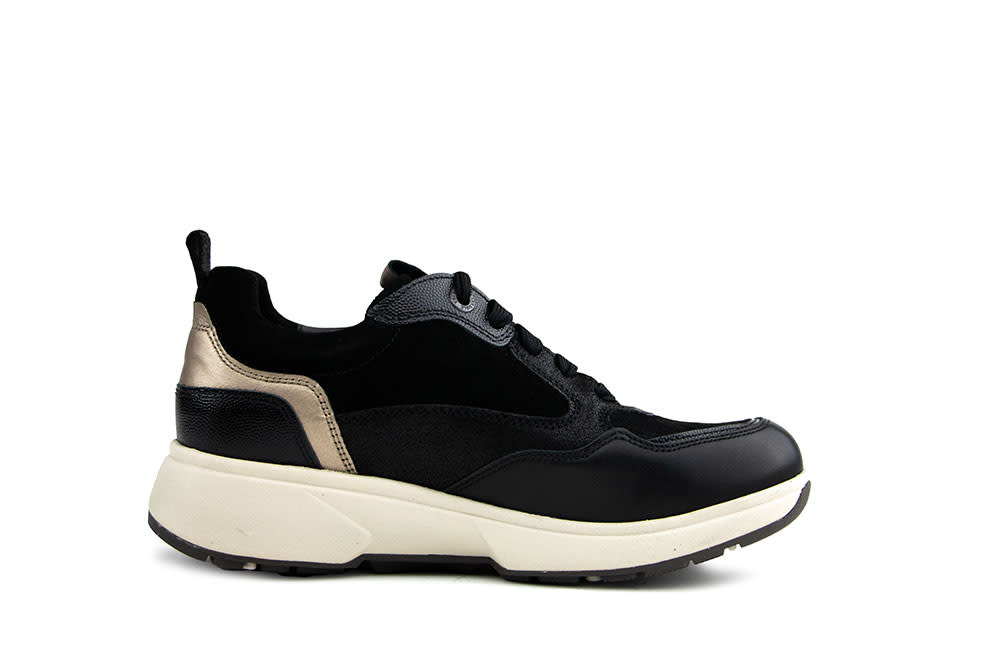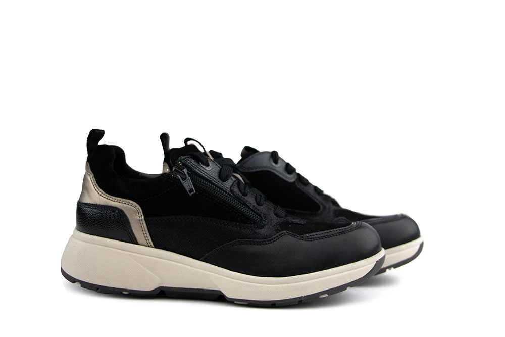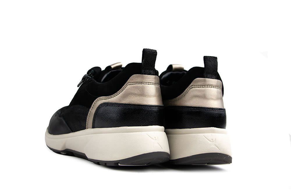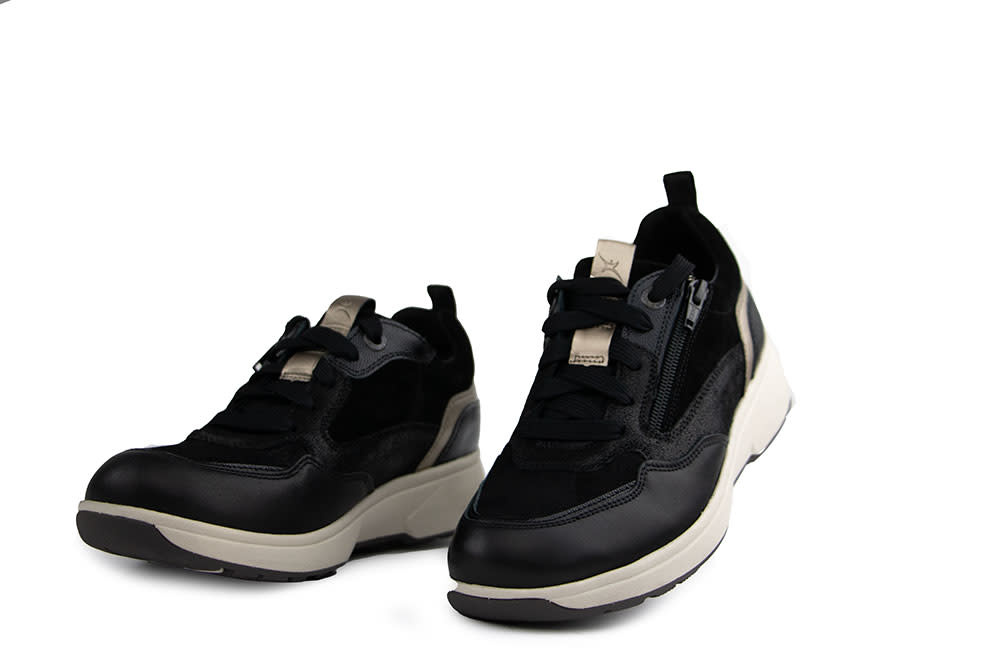Diese sportlichen schwarzen Sneaker von Xsensible vereinen stilvolles Design mit höchstem Tragekomfort. Die Kombination aus Velours- und Glattleder in verschiedenen Nuancen sowie feine Prints verleihen dem Schuh eine lebendige Ausstrahlung. Das dezente Metallic-Finish bringt einen Hauch von Eleganz – ohne Kompromisse beim Komfort.