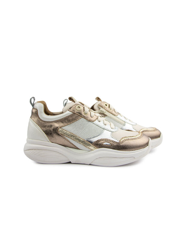 Das Obermaterial besteht aus beigem, off-white, gold- und silberfarbenem Leder, teilweise mit feiner Struktur versehen, was dem Sneaker ein zeitgemäßes Aussehen verleiht. Die Farbkombination sorgt für einen frischen, stilvollen Look, passend zu sowohl lässigen als auch gepflegten Outfits.