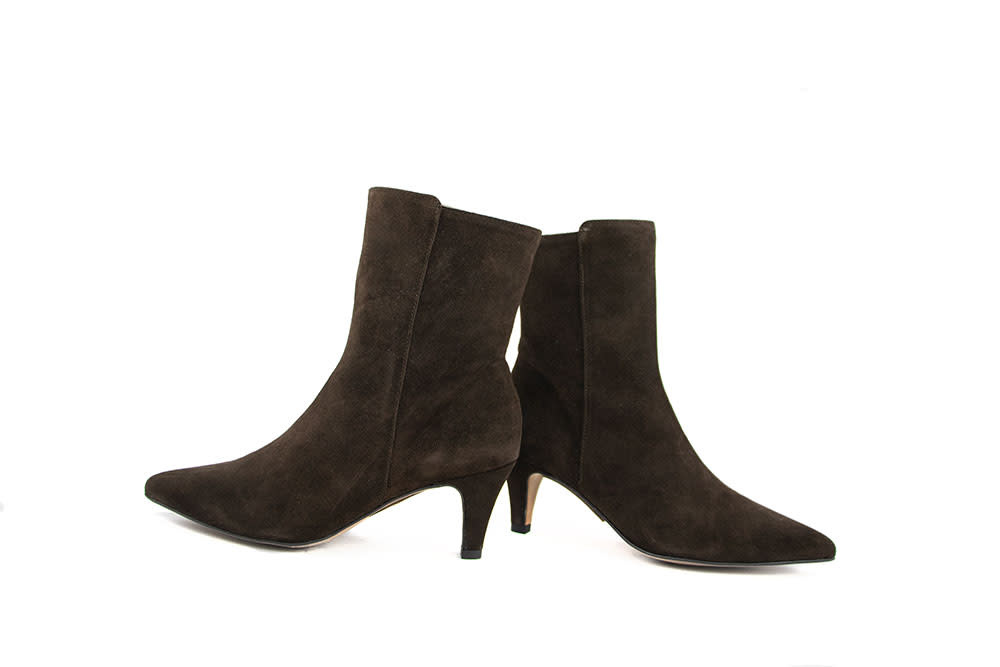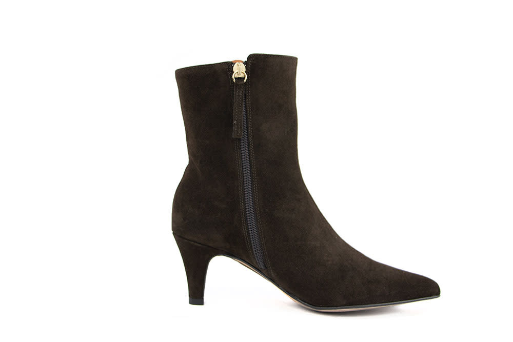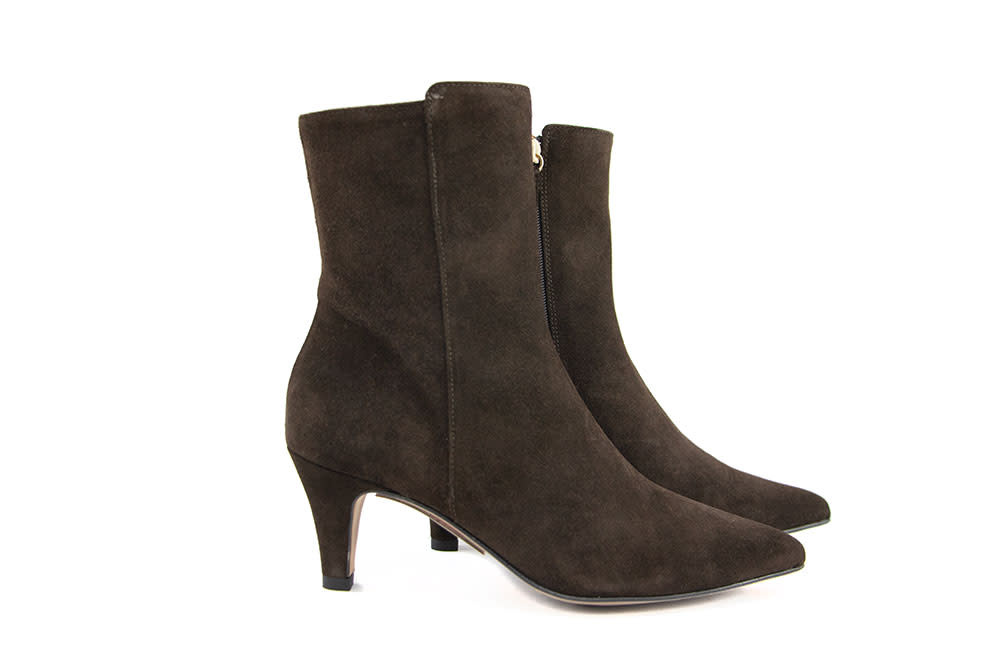 Deze stijlvolle enkellaarsjes van Ángel Alarcón stralen pure elegantie uit. Het chocoladebruine suède voelt zacht aan en oogt luxueus, terwijl de spitse neus het geheel een verfijnde en vrouwelijke uitstraling geeft. Het model valt subtiel tot net onder de enkel en wordt gecompleteerd door een slanke hak van 6,5 cm, perfect voor een elegante houding zonder in te leveren op comfort.