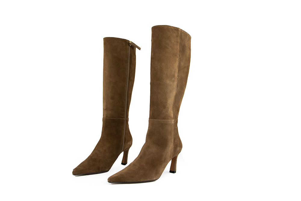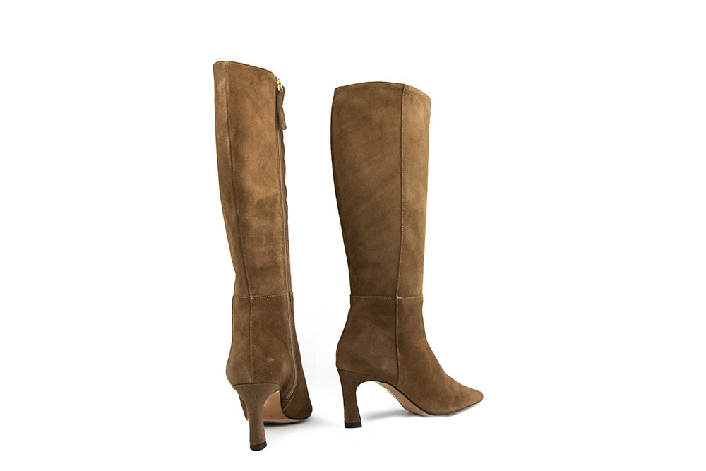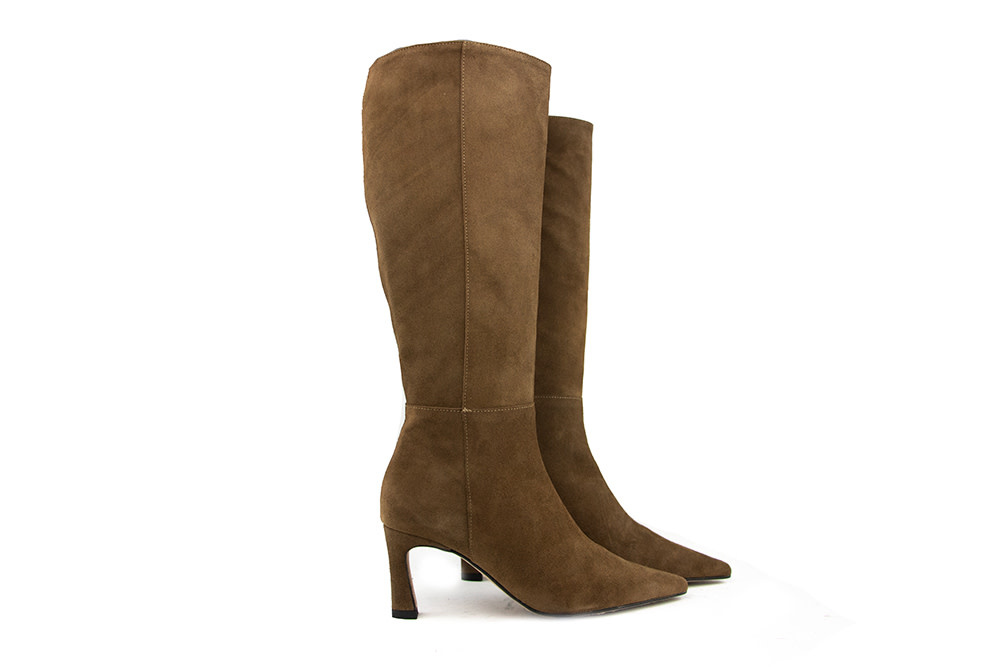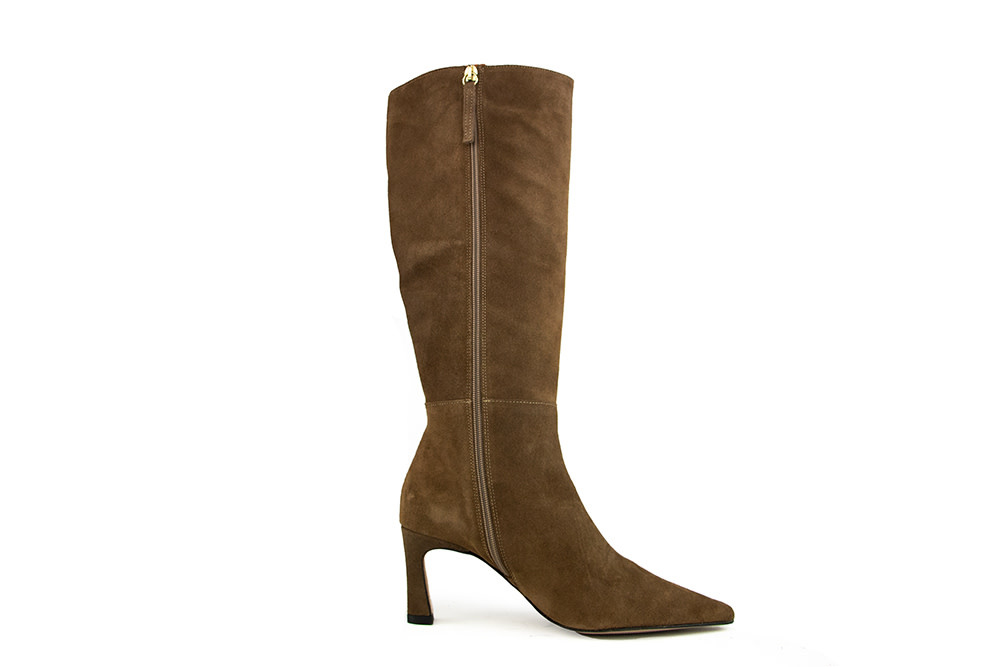 Deze elegante en vrouwelijke lange laarzen van Ángel Alarcón zijn perfect voor de vrouw die stijl en comfort wil combineren. Het taupe/cognac suède met verfijnde belijningen geeft een luxe en moderne uitstraling, terwijl de spitse neus de laarsjes een elegante touch geeft. De kittige hak van 7,5 cm maakt ze ideaal voor een chique look zonder in te leveren op comfort.