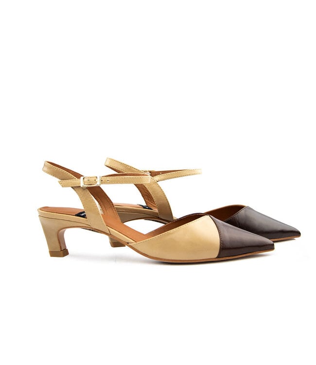 Deze stijlvolle Ángel Alarcón pumps combineren elegantie met een speels accent. Het bovenwerk is uitgevoerd in beige leer met een contrasterende cognac neus, wat het model een verfijnde uitstraling geeft. De spitse neus maakt het geheel extra vrouwelijk en chic.