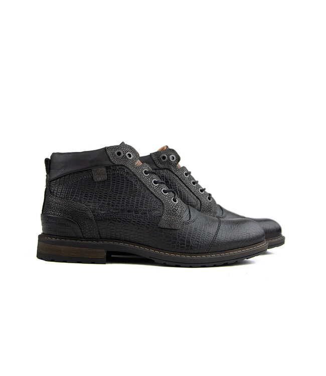 Stoere veterboots voor heren van het merk Australian. De schoenen zijn gemaakt van zwart leer. Deels voorzien van structuur print. De tong is gemaakt van zwart suède. Al deze effecten maken de schoen speels, maar door het rustige kleurgebruik kunnen ze heel divers gecombineerd worden.
