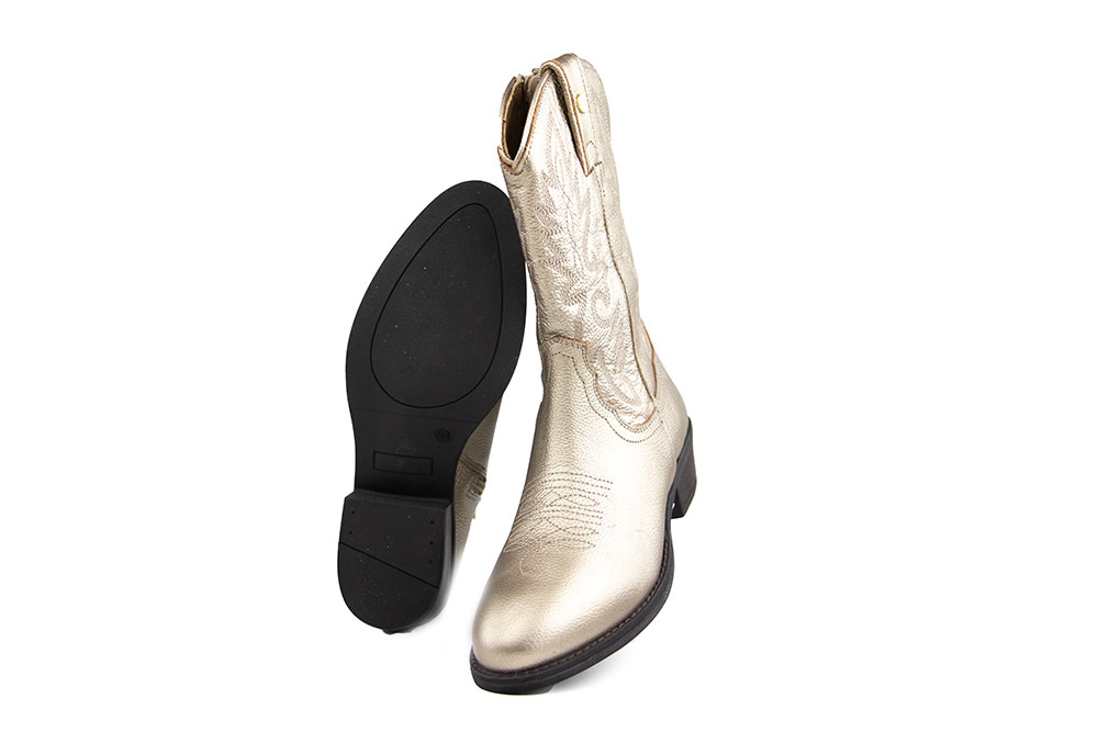 Deze metallic goud leren western laarzen van Develab zijn een perfecte mix van stoer en stijlvol! Het kenmerkende stikwerk, de subtiele belijning op de zijkant en de omsalg op de schacht maken ze een echte eyecatcher.