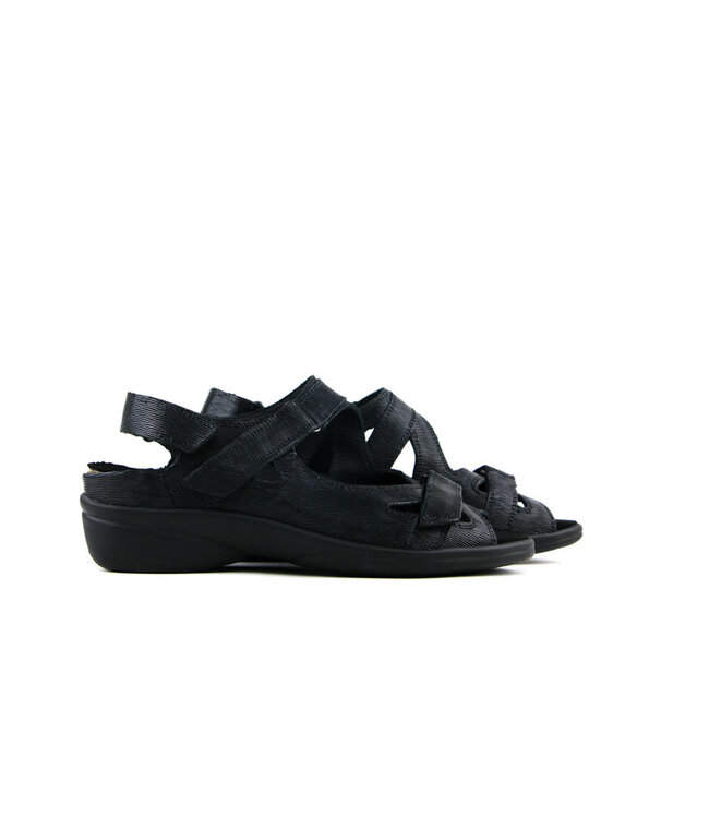 Stoere zwart leren Durea sandalen voor de dames. Ze hebben een streepmotief, inkepingen in de zijkant, een subtiele sleehak en een open achterkant. Aantrekken doe je gemakkelijk met de klittenbandsluitingen. Doordat er drie aanwezig zijn kun je elk element van de sandaal op je eigen voet afstemmen. Extra leuk is dat je ook steunzolen kunt dragen in de schoenen. De K wijdte maakt dat ze extra breed zijn. Het geheel is stoer, sportief en gemakkelijk te combineren.