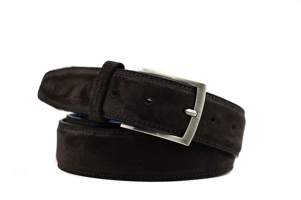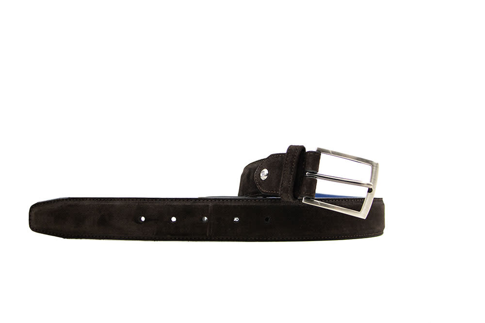 Deze donkerbruine suède Floris van Bommel De Belter 07.19 herenriem is een stijlvolle finishing touch voor iedere outfit. Het verfijnde stikwerk geeft de riem een luxe uitstraling, terwijl de matte gesp zorgt voor een moderne, ingetogen look. De opvallende blauwe voering maakt het ontwerp net wat unieker en herkenbaar Floris van Bommel.