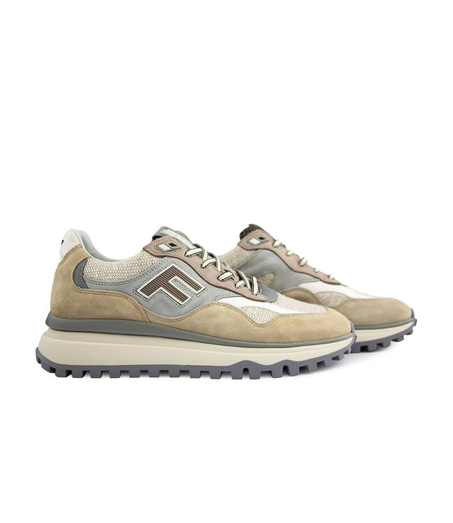 De combinatie van blauw suède en leren vlakken, samen met de witte leren accenten, geeft de sneaker een fris contrast. De herkenbare rubberen Floris van Bommel ‘F’ op de zijkant onderstreept het karakteristieke design van het merk. De textiele tong en leren voering zorgen voor extra draagcomfort, terwijl de tweekleurige blokzool met grijze zoolrand een sportieve én stevige basis biedt.