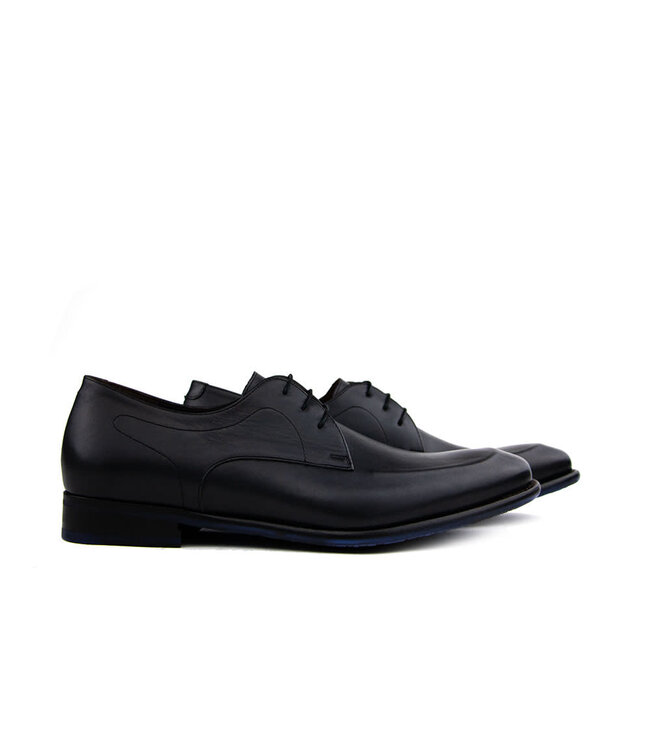 Stijlvolle herenschoenen van Floris van Bommel. De veterschoen is gemaakt van heel donkergrijs leer, met wat kobaltblauwe accenten in de loopzool. De schoen heeft een verborgen spiegelnaad op de neus, wat een moderne look geeft.