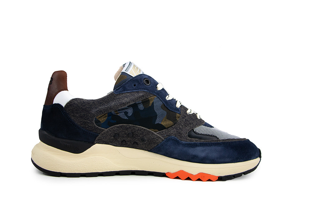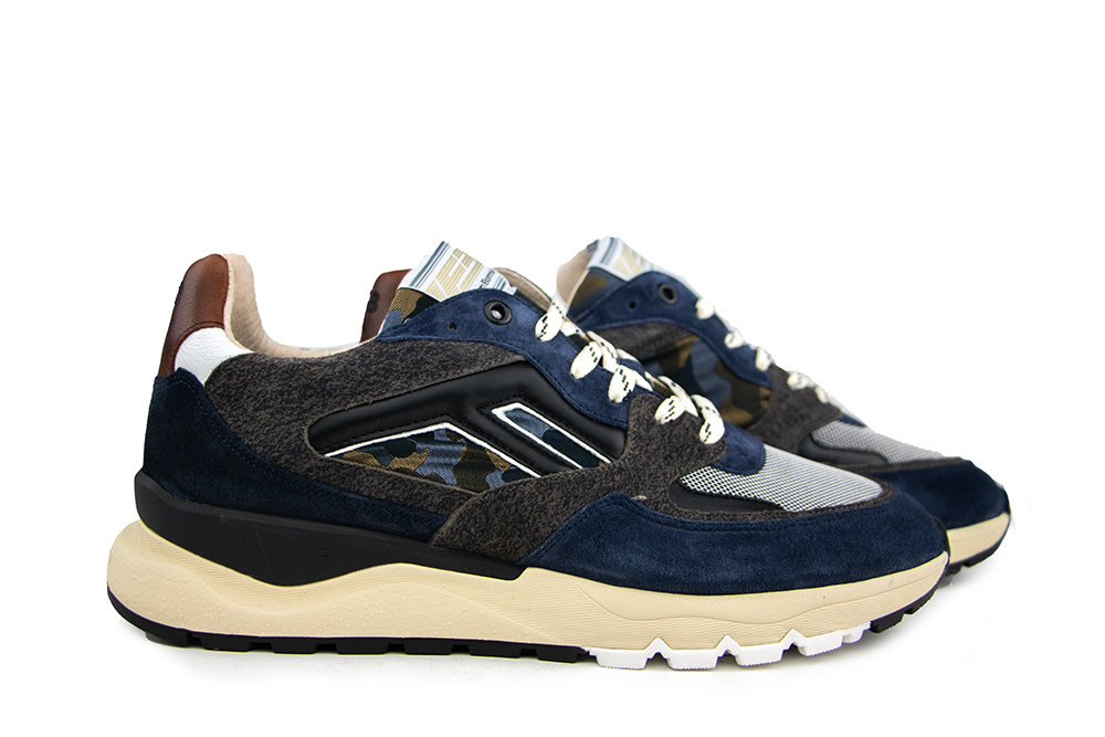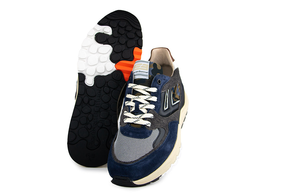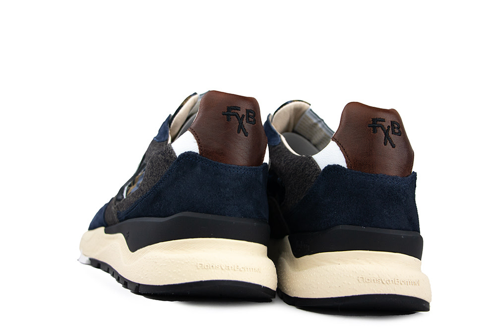 Deze Floris van Bommel De Treener 01.21 is een sneaker voor mannen die durven. De basis van donkerblauw suède wordt krachtig aangevuld met grijze accenten en een opvallende army-print van textiel op de zijkant en tong. Het grote zwarte leren F-logo op de zijkant geeft ‘m die kenmerkende Floris-signatuur, terwijl het cognac leren hielvlak en de kleurrijke zool zorgen voor een verrassend contrast.