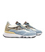 Het bovenwerk is uitgevoerd in lichtblauw suède, gecombineerd met taupe textiel op de zijkant en tong. Offwhite leren belijningen op de zijkant en bovenrand geven een frisse en verfijnde uitstraling, terwijl de taupe suède achterkant en het grijze leren hielvlak een stoere, gestructureerde touch toevoegen. De gele rubberen opzet met logo-accent en de tweekleurige rubberen loopzool zorgen voor een opvallend design en versterken het sportieve karakter van de sneaker.
