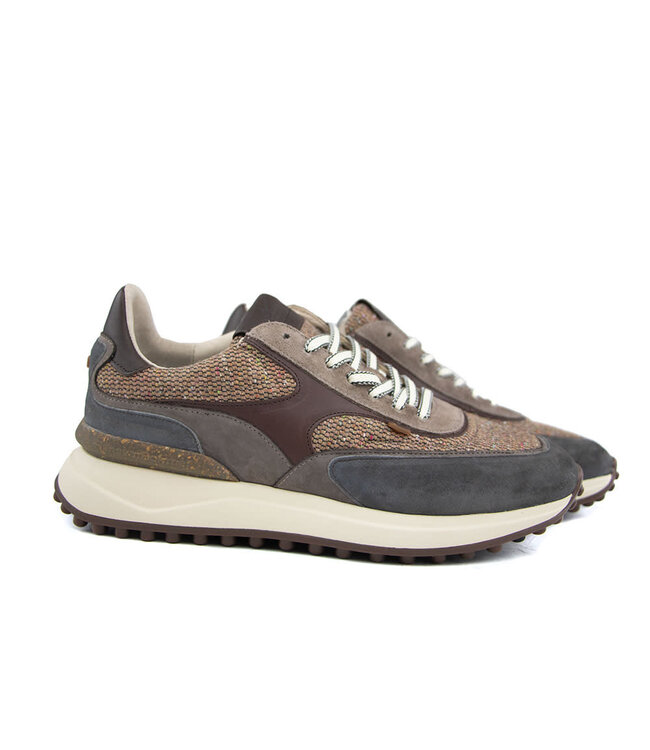 De Floris van Bommel Noppi 43.03 sneakers combineren stijl en comfort in één. Het bovenwerk is gemaakt van grijs en taupe suède, aangevuld met gevlochten taupe textiel en bruine leren accenten, waardoor de sneaker een speels en modern karakter krijgt.