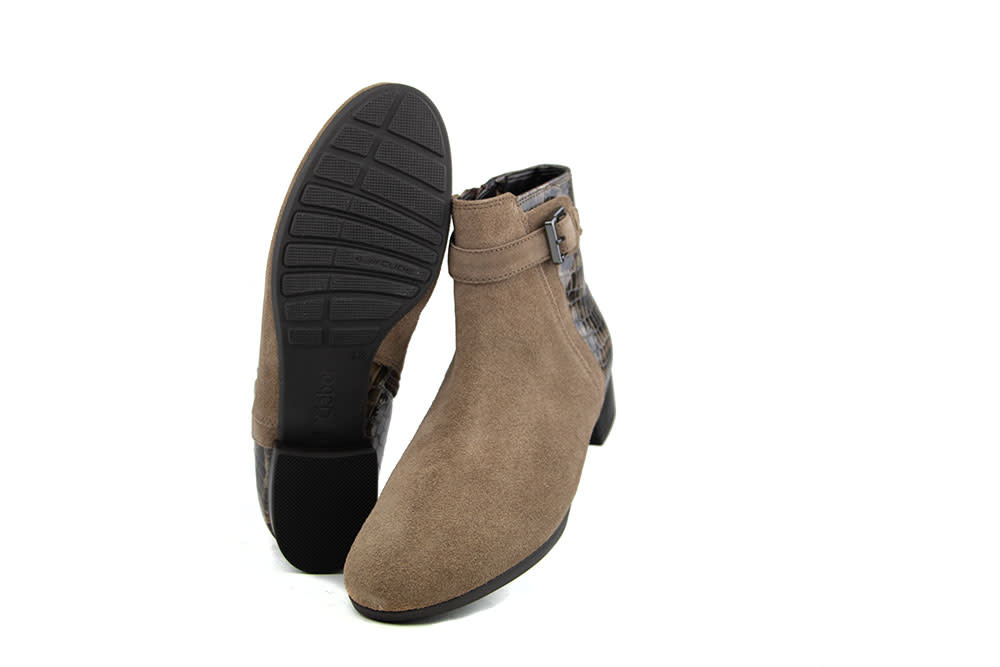 Deze elegante dames enkellaarsjes van Gabor combineren stijl en comfort moeiteloos. Het taupe suède geeft een zachte, luxe uitstraling, terwijl het lakleren hielstuk met croco print een trendy twist toevoegt. De sierlijke gesp maakt het design helemaal af.