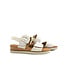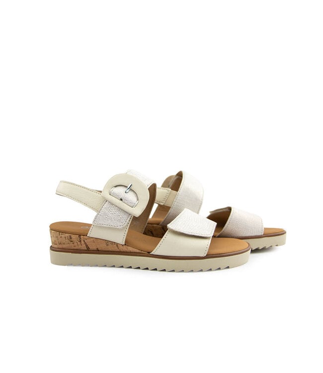 Deze Gabor dames sandaal is een stijlvolle en comfortabele keuze voor de zomer. Het bovenwerk is gemaakt van crème leer, afgewerkt met subtiele zilver draad accenten die het model een elegante touch geven. De klittenbandsluiting met siergesp zorgt voor een gemakkelijke pasvorm en voegt een speels detail toe.