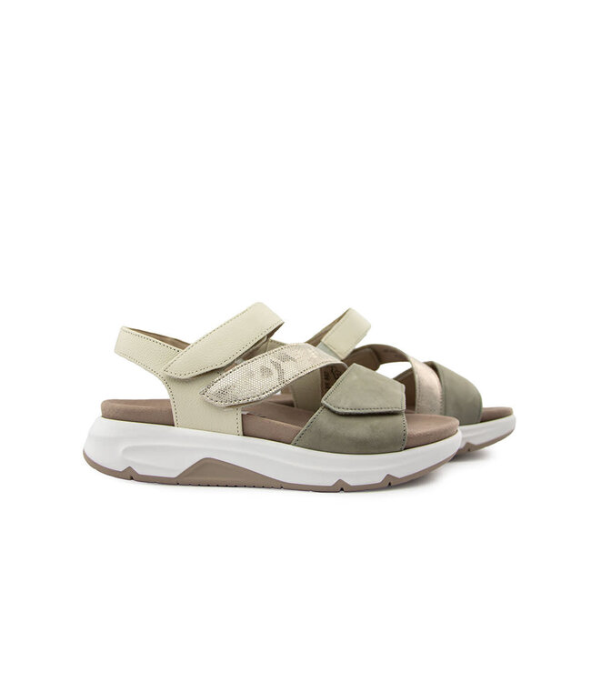 Deze Gabor Rolling Soft sandalen zijn dé perfecte combinatie van comfort en een sportieve, moderne look. Het bovenwerk is uitgevoerd in een multicolor design met brede banden over de wreef en voorvoet. De middelste band heeft een metallic finish met print, wat zorgt voor een speels en opvallend accent.