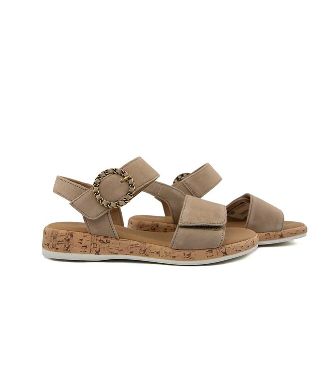 Deze elegante Gabor sandalen zijn een stijlvolle en comfortabele keuze voor warme dagen. Ze zijn gemaakt van zacht beige suède en hebben een bandje over de tenen en een band rond de enkel, beide voorzien van een klittenbandsluiting voor een perfecte pasvorm. Het sierlijke gespje rond de enkel geeft een verfijnde touch aan het ontwerp.