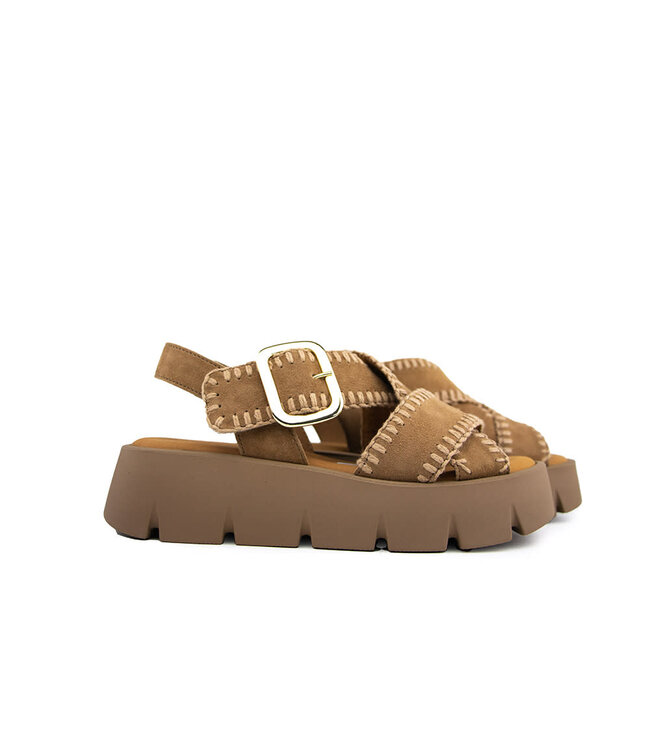 De klittenbandsluiting is voorzien van een sierlijke gesp, wat de sandalen extra elegantie en draaggemak geeft. De leren voering voelt zacht aan en het uitneembare voetbed biedt extra comfort. De dikke rubberen plateauzool zorgt voor stabiliteit, grip en een subtiele lift bij iedere stap.