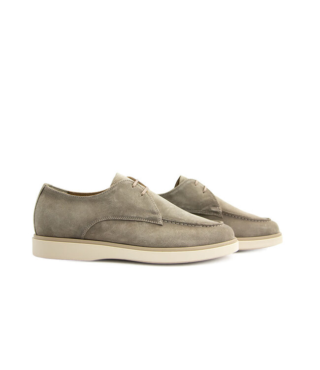 Deze Taupe suède heren veterschoen is een stijlvolle kruising tussen een bootschoen en een veterschoen, uitgevoerd in taupe suède voor een tijdloze, neutrale look.