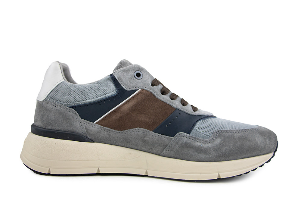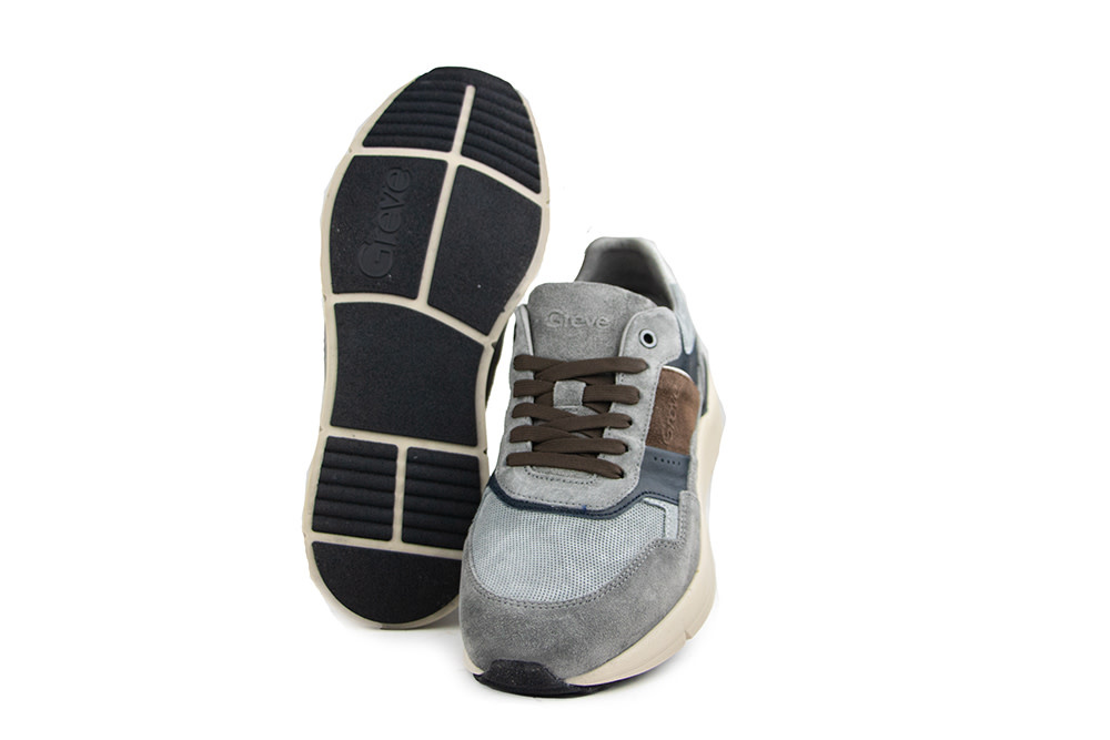 Deze Greve heren sneakers zijn een stijlvolle mix van casual en chic. Het bovenwerk is gemaakt van grijs suède in verschillende tinten, met een bruin suède vlak aan de zijkant en blauwe leren vlakken erboven en eronder – een prachtig lagenspel dat zorgt voor een luxe en dynamische uitstraling.
