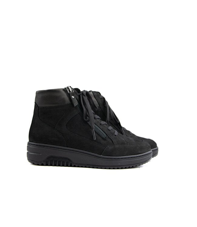 Sportieve dames sneakers van het merk Hartjes. De veterschoen is uitgevoerd in een hoog model en gemaakt van zwart suède. De schoenen hebben leestwijdte K en zijn dus breder dan gemiddeld.