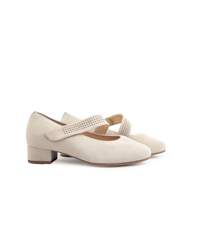 Het bovenwerk is uitgevoerd in licht taupe suède, wat de schoen een zachte en verfijnde look geeft. De stompe neus zorgt voor extra ruimte bij de tenen en draagt bij aan het comfortabele draaggevoel. Langs de bovenrand loopt een textiele afwerking, wat niet alleen mooi oogt maar ook prettig aanvoelt rond de voet.