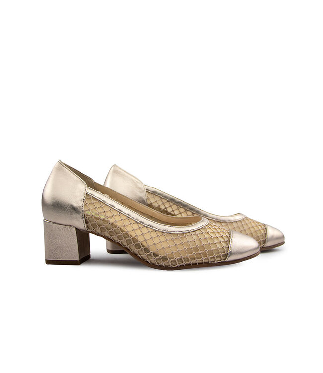 Rondom de schoen loopt een doorzichtig, geborduurd motief, wat zorgt voor een bijzonder licht en sierlijk effect. Dit transparante detail geeft de pump net dat beetje extra finesse zonder te overheersen. Het leer loopt bovendien stijlvol door in de hak van 4,5 cm, waardoor het geheel één mooi, harmonieus ontwerp vormt.