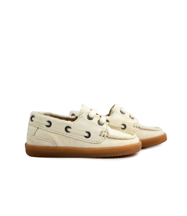 Deze HIP meisjesschoenen hebben een unieke en stijlvolle uitstraling. De schoenen zijn uitgevoerd in crème pony hair, wat zorgt voor een luxe en speels effect. Het model is geïnspireerd op een klassieke bootschoen, maar dan in een trendy uitvoering voor meisjes.