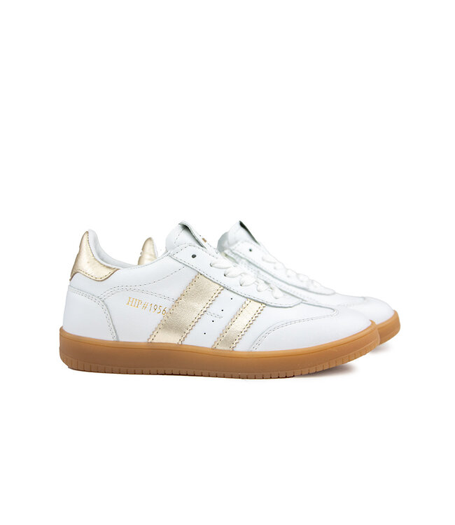 Met deze sportieve wit leren HIP meisjes sneakers kan je dochtertje er stijlvol tegenaan dit voorjaar. Ze hebben opvallende metallic gouden gekartelde strepen op de zijkant, brede witte veters, een gouden leren hielvlak en logo accenten. Je dochter trekt de sneakers makkelijk zelf aan met de rits. De gedeeltelijk leren voering, gewatteerde elementen en stevige zool maken het een super schoen om te dragen. Combineren is geen probleem door de witte kleur.