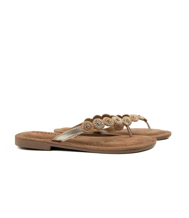 Deze Lazamani slippers zijn een echte eyecatcher voor zomerse dagen. Het bovenwerk is gemaakt van goudkleurig leer en voorzien van strass steentjes in cirkels, wat een sprankelende en elegante uitstraling geeft.