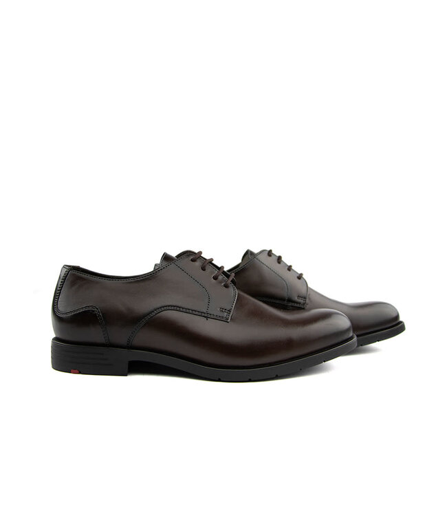 Het bovenwerk is uitgevoerd in donkerbruin glad leer en straalt pure klasse en eenvoud uit. Het klassieke design wordt versterkt door de smalle donkerbruine veters, die zorgen voor een verzorgde en traditionele uitstraling. De zwarte rubberen loopzool sluit naadloos aan bij het elegante karakter van de schoen en geeft het geheel een rustige, nette look.