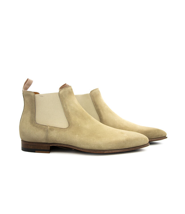 Deze Magnanni Chelsea boots zijn een perfecte mix van klassieke elegantie en moderne details. Het bovenwerk is uitgevoerd in zandkleurig suède met een mooie poetsing, waardoor de boots een luxe en verzorgde uitstraling krijgen.