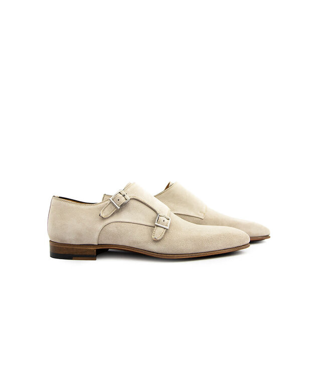 Deze Magnanni heren schoenen met dubbele gesp zijn een stijlvolle en verfijnde keuze voor mannen die houden van klassieke elegantie met een modern tintje. Het bovenwerk is uitgevoerd in taupe-grijs suède met een grof afgewerkte structuur en een prachtige belijning op de zijkant, wat de schoen karakter en diepte geeft.